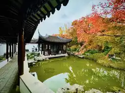 The song of maple leaves in the winding water dazzles the pond, and you can walk along the corridor to embrace the pearly frost. Red leaves fill the sky with warm autumn clouds, and green shadows flow golden against the windows.