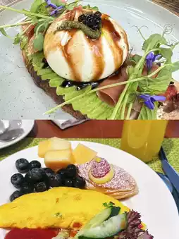 During breakfast, it is recommended to go before 9:40, as there are fewer people and the environment is good. The orange juice is delicious, the blueberries are sweet, and the overall breakfast can score 80 points.