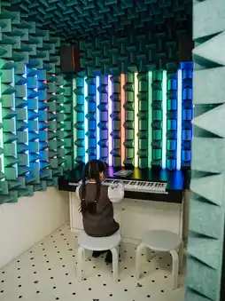 The colorful glass house is not only a great photo spot, but also a small music hall where you can play songs.