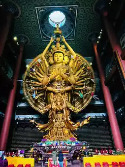 - The tallest indoor Guanyin statue: The Thousand-Armed and Thousand-Eyed Guanyin statue, 27.352 meters high, is located in the Guanyin Pavilion.
