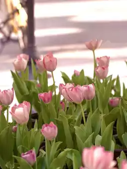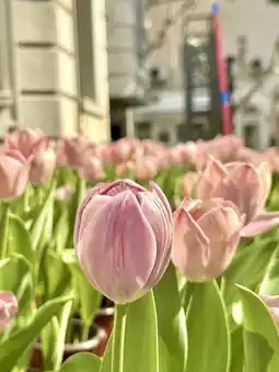 Basking in the warm sun makes spring feel just around the corner. This temperature is perfect for a city walk. The tulips on Xinle Road are in full bloom, with purple, red, and white colors looking especially romantic against the European-style buildings.