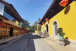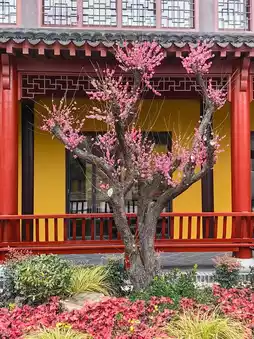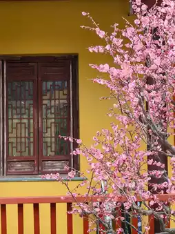The yellow-walled corridor surrounds the courtyard, making these three plum trees appear even more slender. The red flowers on the branches gently tremble in the breeze. Tripods have already been set up under the corridor, and several photography enthusiasts are focused on adjusting their angles. The shutter sounds rise and fall, as if keeping rhythm for this spring solo performance.