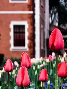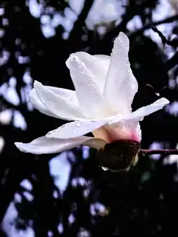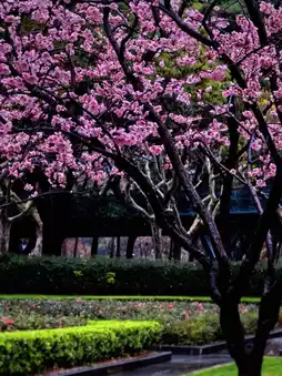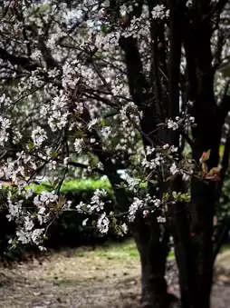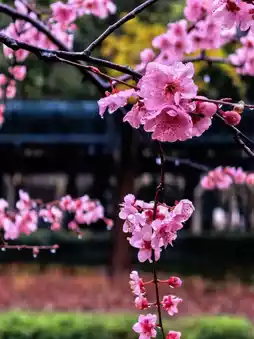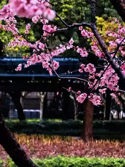 The white magnolias tremble in the wind, holding bone china cups, their petal tips dripping with cold pearl-like light, as if to fill the entire early spring chill; the pink peach blossoms in the rain look like freshly blossomed rouge tears, frozen on silk-like thin petals; the purple-leaf plums have pure white and pale pink petals draped over dark branches like wedding gowns; deep within the rain curtain, tulip spike-shaped buds are tightly wrapped in satin swaddling, waiting for a sunny morning to arrive.