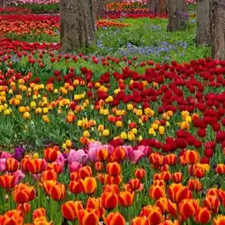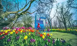 At the Fangta Garden Tulip Exhibition, 40,000 tulips form a giant palette, with 20 colors ranging from rouge red to moonlight white unfolding gradually, creating a step-by-step flower viewing experience.