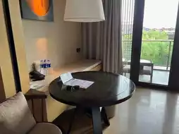 The room interior had wooden floors instead of carpet, so it felt clean without dust. The interior was decorated in wood tones, creating a warm and cozy atmosphere. The sofa next to the bed was foldable and could be unfolded into an extra bed when needed.