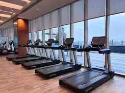 The gym is very square in shape, fitting many fitness machines into this rectangular space. Outside the floor-to-ceiling windows is a huge terrace, and ample sunlight streams in from both sides, making it feel like a sunroom.
