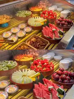 The highlight fruit is the large, sweet, fragrant strawberries with firm flesh—truly excellent. The buffet price is about 179 yuan, or around 900 baht, which is very worth it considering the quality and variety of food offered.