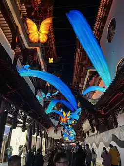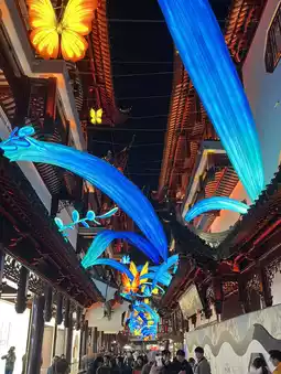 The Yuyuan Garden Shopping Mall area in Shanghai is a paradise for shoppers and food lovers. Walking inside feels like strolling through an ancient Chinese market, with building walls adorned with flute and fan patterns, and soft Chinese music playing along the way.