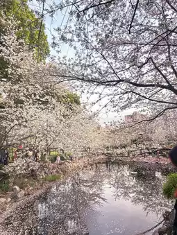 I continued my walk to Luxun Park 🌳. This peaceful park is full of cherry blossom trees, small rivers, and quiet city paths. You can also see a cute cat posing 🐾. It’s perfect for a relaxing stroll under the peta ls. Bring your camera because the reflections in the water and the pink clouds of flowers are magical!
