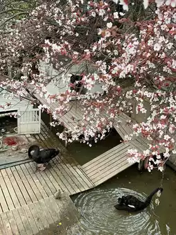 👣 Buildings covered in ivy ~ Willow Castle, with a lush green lawn in front that looks like it stepped out of a fairy tale. Not far away is Moon Qin Lake, where elegant black swans glide gracefully. The cherry blossoms by the lake complement the water perfectly, creating a poetic and picturesque scene.