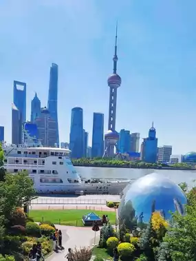 North Bund Greenland Shanghai is a large park in Shanghai. It is a place for relaxation and exercise for the people of Shanghai, located by the river with a beautiful view of the opposite side, including the Pearl Tower, surrounded by many tall buildings. It is a popular spot for Chinese tourists to take photos at this point. The atmosphere and grandeur make it impossible not to snap a picture with the Pearl Tower. The highlight here is the silver pearl dome, a popular photo spot with a very long line. If anyone wants to take photos here, you might need to come early in the morning. Personally, I called a Didi taxi to drop me off at the park entrance, which is very convenient. Taxi fares here are not expensive. I highly recommend it if you come with a group. From this point, you can also walk to many other popular photo spots nearby 😊😊😊