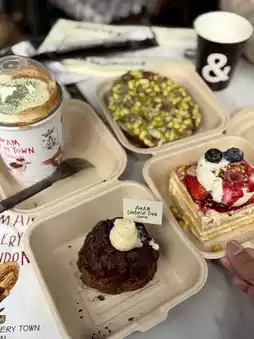The atmosphere inside the café is perfect for chilling with friends or even coming alone for a cozy vibe. They offer a wide variety of pastries and drinks, including croissants, cheesecakes, scones, and authentic English afternoon tea sets.
