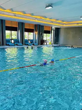 The indoor pool has a baby pool and a standard pool, with clean water.