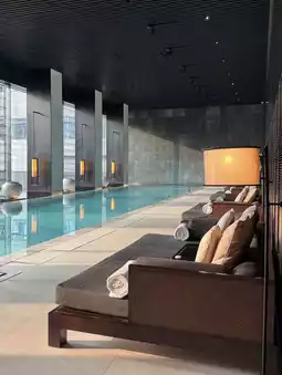 Hidden in the bustling Jing’an district, The PuLi Hotel represents understated luxury in my heart. Its infinity pool, tucked away on the top floor, exudes a tranquil beauty inspired by Eastern Zen. The pool is crafted from deep gray stone and warm wood, with the water extending beyond the entire glass curtain wall, offering a distant view of the city skyline like an ink wash landscape painting, layered and profound.