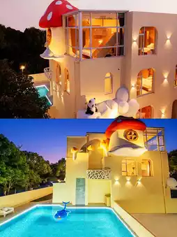 The exterior looks like a colorful crayon-drawn castle, with classic fairy tale characters (Snow White/Winnie the Pooh, etc.) painted on the interior walls. Step inside to enter a dreamy fairy tale kingdom.