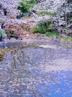 🌸Cherry blossoms surround the artificial hill, pond, and stone arch bridge. Directly in front of the hill is Sweet Love Lake, where cherry blossom petals gather on the water surface and walkways. The most breathtaking sight is the petals floating all over the pond, colorful like fresh snow, rivaling even Kyoto’s cherry blossoms.