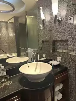 The bathroom was finished with granite-like tiles, giving it a luxurious feel, and it was convenient to have two sinks. There was a large bathtub perfect for enjoying a half-body soak, and the generously provided amenities and fluffy bathrobe left a strong impression. Overall, it was clean and well-maintained.