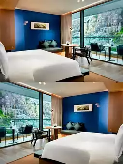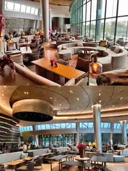 As soon as you enter the hotel, the rock-textured walls paired with vintage industrial-style lighting perfectly combine ruggedness and luxury. It instantly feels like traveling through time into a fascinating world of vintage industrial style. The high-ceilinged lobby is dominated by dark tones, with rock-textured walls complementing metallic decorations. A giant crystal chandelier hangs like stalactites in a mine cave, casting light that makes you feel like you are in an underground palace.