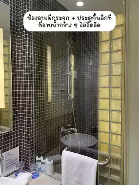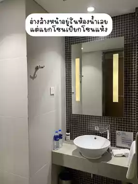🪞The bathroom here is not separated from the shower like other places. The sink is inside the bathroom. The bathroom light is not very bright, but the mirror near the work desk works better. The Rain Shower has a glass door separating the wet and dry zones. The bathroom is not too small to feel cramped while showering.