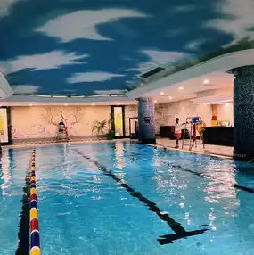Pool: 23m*10m, not small by the numbers... but the pool is not rectangular; the curved edges reduce the actual usable area. One lane is allocated for children, leaving three lanes for adults. The pool depth ranges from 1.3m to 1.9m, with one side being deeper.