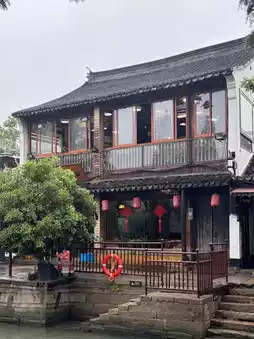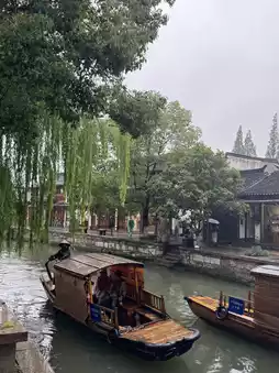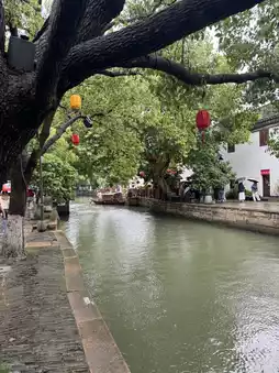 We walked across the ancient stone bridge, stopped by a local tea shop, and visited the quiet Guanyin temple by the canal. The rain-soaked trees, old buildings, and their reflections in the water brought an unexpected sense of peace.