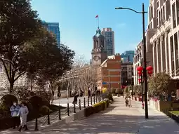 ▸ The red brick clock tower hides gears under its green roof! The light and shadow cut by the clock hands splash over the skyscraper cluster, and the fluttering national flag suddenly becomes a bowtie in the steel forest.