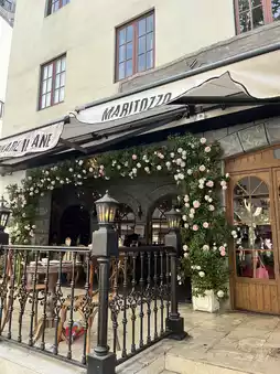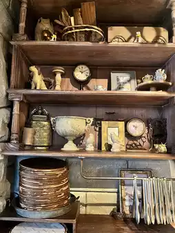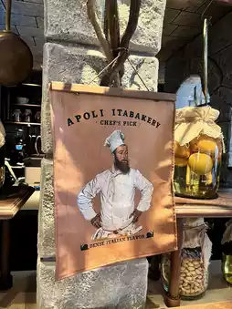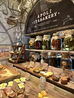 The interior features stone walls, terrazzo tile floors with a water ripple pattern, and is decorated throughout with dried flowers and natural materials, giving a magical feeling as if you’ve stepped into an old European bakery.