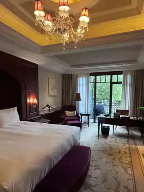 The room features a private viewing balcony, where you can enjoy a panoramic view of 55,000 square meters of French garden scenery, with red brick villas and century-old trees creating a classic visual. The room’s interior blends vintage elements with luxurious amenities, including rattan lounge chairs and sycamore light filtering through window lattices, paired with the iconic clawfoot bathtub, creating a living atmosphere rich in historical depth and cinematic quality.