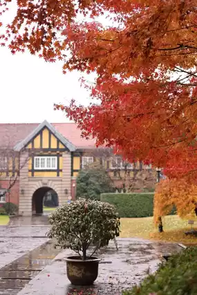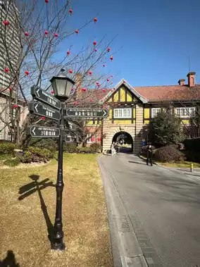 The building features extensive use of red bricks, a large crystal chandelier in the lobby, and a European-style garden with small bridges and flowing water, completely embodying the style of a European resort estate.