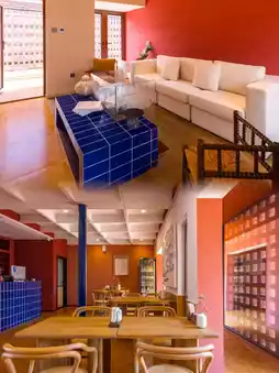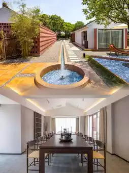 Atlas Yun Tu·Dianshan Lake Homestay is transformed from an old factory, with designers cleverly preserving the original building structure and blending it with a modern minimalist style to create an art-filled space. Exposed concrete walls, wooden furniture, transparent floor-to-ceiling windows, and plenty of greenery and artworks.