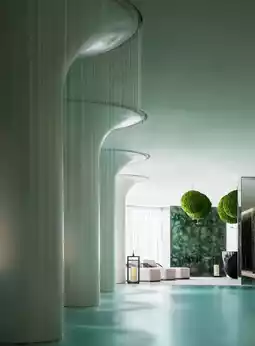 The restaurant is a flowing feast. Booths with slanted beam structures line up along the floor-to-ceiling windows, outside which rush the river and a dazzling skyline, while inside is a dreamlike theater of light and shadow. The green gradient decor shifts between light and dark, reminiscent of the flickering neon in old Shanghai ballrooms. Eastern warmth and refined Shanghai style raise their glasses together in celebration at this moment.
