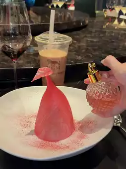 The dessert is the highlight of the night—both beautiful and delicious! A cake without a cake base. Sprayed with rose “perfume,” and when cracked open, inside is raspberry mango chocolate cake and black sesame roll, full of ceremony.