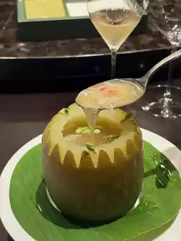 The soup is served in a melon bowl, presenting a fresh crab and winter melon soup. It’s far from simple—it's said to include nearly ten kinds of delicacies like sea conch, Jinhua ham, frog, Japanese scallops, and more, blended with snow crab meat...