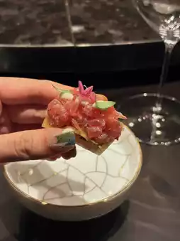 The appetizer is a yuzu tuna sandwich on a thin pancake base. The yuzu is slightly sour and juicy, perfectly matching the soft thin pancake and tuna.