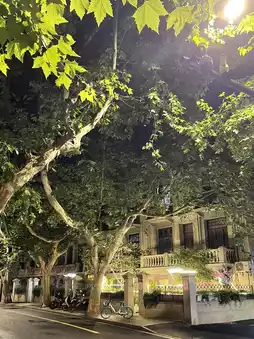 From the glowing riverside, head toward Wu Kang Road (also known as Wukang Lu), a historic tree-lined street in the French Concession area that feels like stepping into old Europe 🇫🇷🏡. At night, the warm streetlamps cast a golden glow on century-old villas, brick townhouses, and charming boutique cafés. The quiet, leafy avenues are perfect for a slow evening stroll, far from the city’s usual hustle and bustle.
