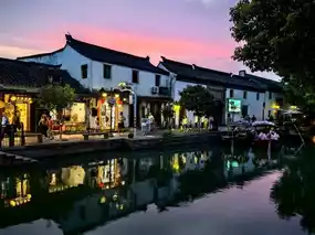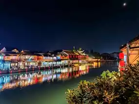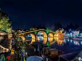 At night, Zhujiajiao’s ancient city glows with warm lanterns and gentle lights along its canals and stone bridges. Reflections shimmer on the water as riverside teahouses and shops create a lively yet peaceful scene. The blend of history, soft illumination, and water views turns the town into a magical nightscape.