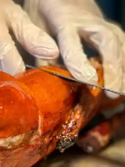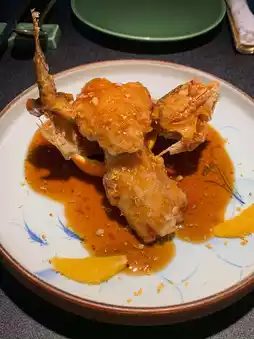 The signature dish, Peking Duck, was sliced by the chef right at your table. The crispy skin and juicy meat, paired with pancakes, were delicious. The Qianlong Emperor Cabbage Cold Roll, grilled abalone, French short rib consommé, and cheese-topped oysters were all luxurious and satisfying.