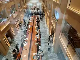 Entering Xujiahui Bookstore, you're greeted by a refreshingly expansive atrium spanning three floors, complete with a 30-meter-long reading table. Wood tones and vaulted ceilings create a warm and majestic atmosphere, inviting relaxation and focus. Sunlight streams in through large windows, illuminating the harmonious blend of books and greenery, creating a delightful atmosphere. The cleverly designed exhibition spaces allow readers to experience culture and art while reading. This is more than just a library; it's a tranquil corner of the city where one can experience the beauty of life.
