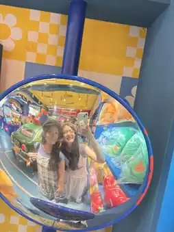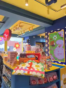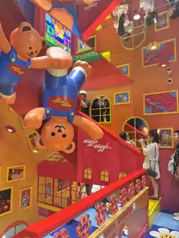 As soon as you step inside, you'll be greeted by bright and colorful décor. The main colors are red, yellow, green, and blue, along with neon lights and unique decorations such as large teddy bears and adorable toys. The store offers various photo zones, including popular spots like the spiral staircase and the colorful walls, perfect for capturing stunning photos.