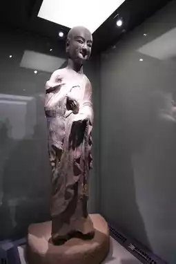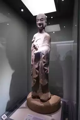 Originating from Cave 102 of the Maijishan Grottoes, this disciple statue features a handsome face, long neck, rounded shoulders, a symmetrical round face, slightly squinting eyes, long and clear eyebrows, a smiling mouth corner, gentle and reserved expression, embodying the Western Wei Buddhist sculpture’s artistic pursuit of secularization and humanization.