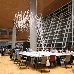 Designed with sleek glass walls and layered geometric forms, the building resembles a stack of open books or floating scrolls β a fitting tribute to knowledge itself. Natural light pours into the vast interior through panoramic windows, creating a calm, airy atmosphere ideal for study and inspiration.