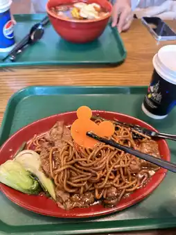A sizzling bowl of red noodles served with adorable Mickey meatballs 🐭💛
