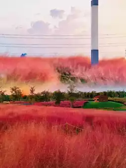 - Hundreds of kochia plants cluster together, round and fluffy like red plush balls, looking like a pink cloud descending to earth from afar.