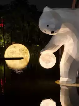 The geometric white bear hugging the moon, a popular photo spot, with warm yellow lights reflecting on the water, every shot is a vibe masterpiece! High-five the bear to light up the moon in your hand~