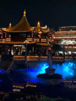 * Yu Garden and City God Temple area are peaceful after dark, softly lit with lanterns.