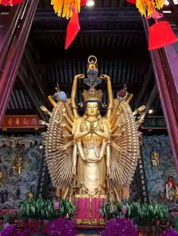 The temple houses several large Buddha statues for worship, including Shakyamuni, Avalokiteshvara, and various Bodhisattvas.