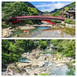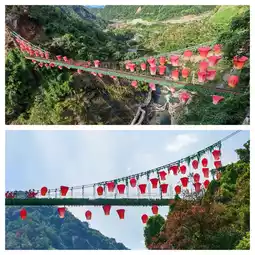🌉 A red bridge spans the emerald waters, with rafting boats gliding underneath. Lush green mountains and trees line both sides, making every snapshot a picturesque masterpiece. A high-hanging suspension bridge adorned with red lanterns🏮 gives the sensation of walking on clouds. From above, you can overlook the valley streams and distant villages, fully embracing the wuxia vibe!
