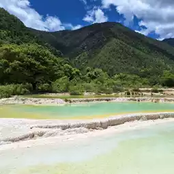 A land of white limestone and clear blue water amidst the surrounding green mountains, a real wonder of nature.