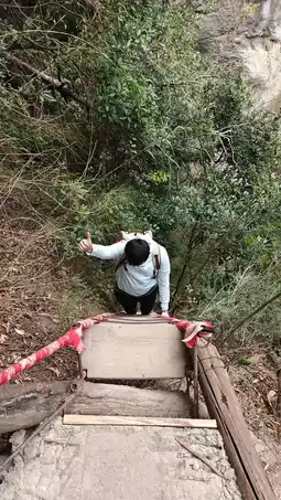 The fifth section is from Teacher Zhang's Guesthouse down to the Contemplation Stone by the Jinsha River. There's a 15 CNY passage fee here. Once you reach the Jinsha River, you'll see the popular Contemplation Stone. However, it's essentially monopolized, and taking photos there costs 98 CNY per person. Whether you take photos or not is up to you. From here, you can actually walk further to challenge the Sky Ladder and see the One-Line Sky. But due to limited time, we chose to return to Teacher Zhang's Guesthouse and take the more thrilling 168 Brave Men's Cloud Ladder. It's a vertical wooden ladder, very exciting, divided into three sections with resting spots in between. Overall, it's not difficult and worth the challenge. There's a 10 CNY fee per person at the top. After returning to Teacher Zhang's Guesthouse, you can wait for the bus back to Lijiang.