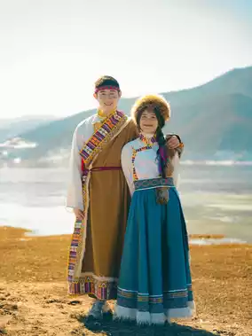 Sunlight spills between snow-capped mountains and serene lakes, while gentle breezes sweep across the grasslands and the flowing hems of Tibetan attire.